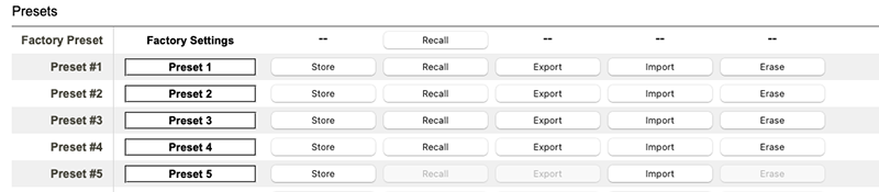 This powerful feature saves current settings to 1 of 20 available Preset slots. Settings on the Configuration page are stored in the preset and any preset may be recalled at any time, returning the KUMO to the previously stored state. Items stored as part of a preset are: