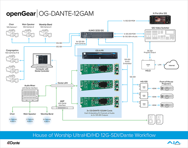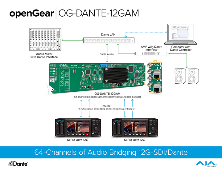 OG-DANTE-12GAM bridges between SDI sources and destinations with embedded audio to/from the Dante audio ecosystem. It's your SDI/Dante Gateway.