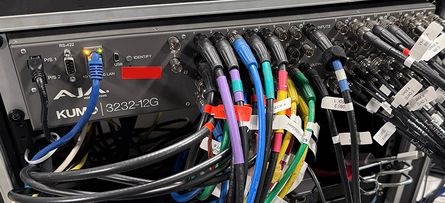 Brian: For offsite projects, we typically carry an AJA Io 4K Plus with us to support external Thunderbolt I/O for encoding setups. It allows us to keep our footprint small by using laptops or compact systems running OBS or vMix, rather than clunky workstations. Io 4K Plus is also useful when we need to add just one or two extra inputs, and most often serves as our I/O for final encoding and delivery.