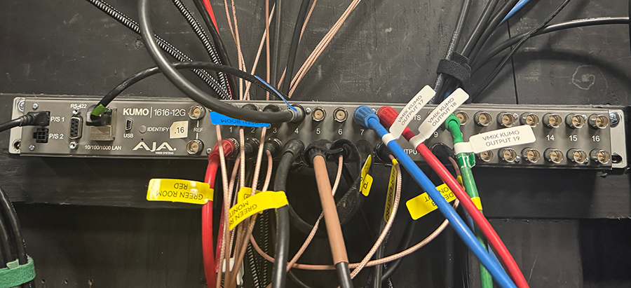 We had to record every signal: camera ISOs, composited outputs, and isolated background feeds. Thankfully, we were able to use AJA KUMOs to route those SDI signals to all the necessary hardware, recorders, and displays across the facility. They were a real clutch for us on the project. We sent the composited feeds to the monitors as well as the camera operators, so they could see if anything was out of the frame and recorded. The agility they provided made the workflow far more efficient and allowed us to maintain a more seamless, low-latency production environment.