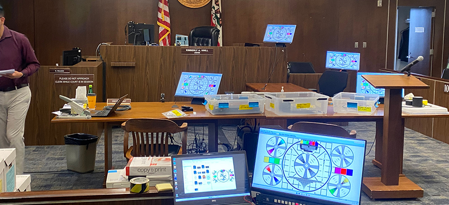 I use HDMI distribution amps, matrix switchers, and kill switchers for full control of up to seven monitors in the courtroom. While the monitors for the judge, lawyers, and witnesses typically stay live, I shut off the jury monitor as needed. Showing the jury documents they’re not allowed to see is prejudicial and could lead to a mistrial. The whole case could get knocked out, so I only do as I’m told and listen closely to the lawyers.