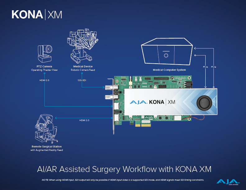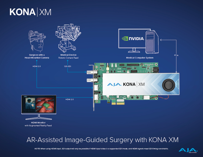 Medical imaging workflows require low latency and frame-accurate performance. AJA I/O cards equipped with NVIDIA GPUDirect RDMA deliver deterministic sub-frame latency and direct GPU transfer, ensuring real-time response for inference, visualization, and surgical control.. SDI and HDMI input/output options support HD to 4K/UHD resolutions at up to 60p, with uncompressed video and embedded audio. The result: precise timing and signal integrity — essential for the safe, responsive operation of surgical and diagnostic systems. Refer to NVIDIA GPU Direct for details on supported systems.
