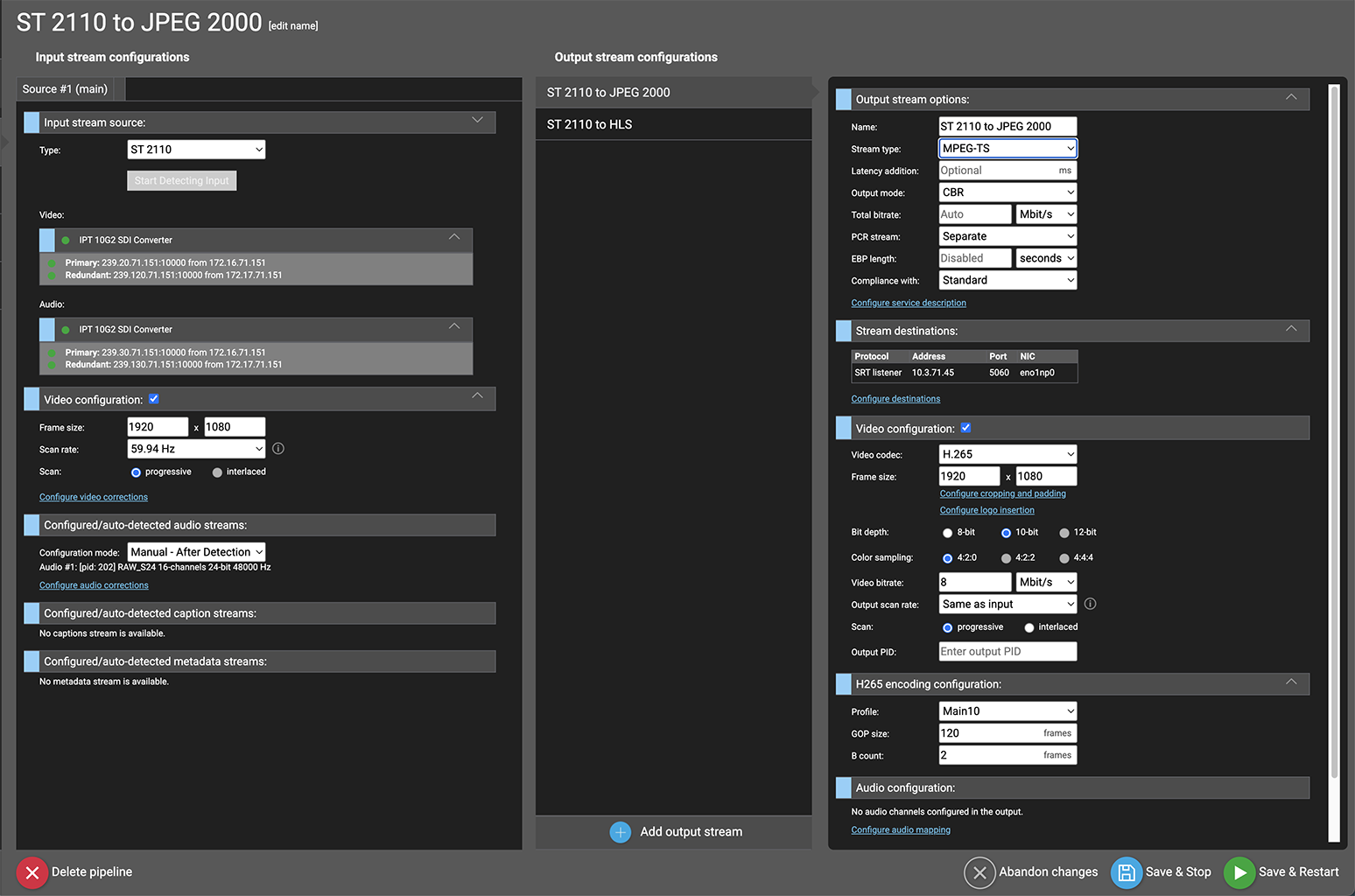 Telcos, IPTV, and cable operators are often presented with an SMPTE ST 2110 source or a live event or live production, which is needed as a simple MPEG-Transport Stream with an H.264 encode. The delivered stream may be required for further processing (storage, production) or streamed directly to an IPTV/Cable network.