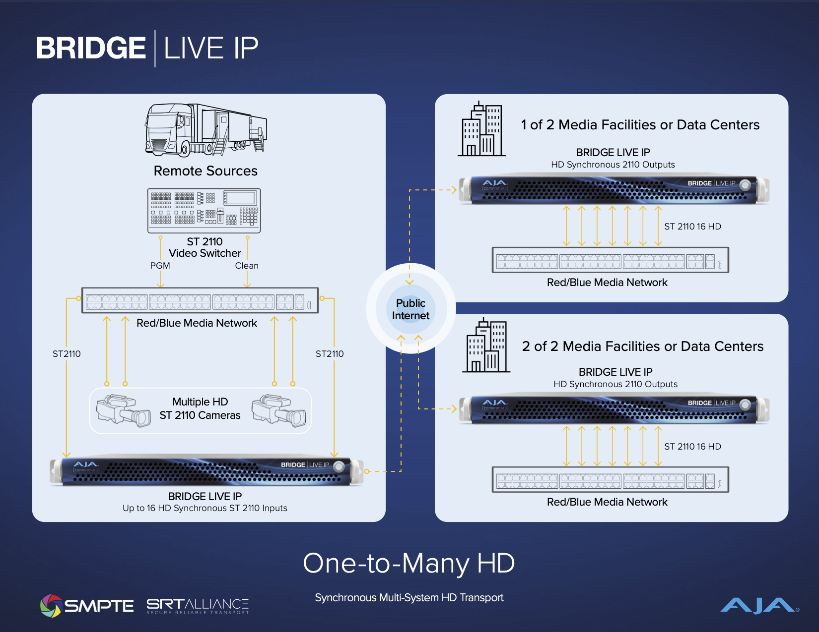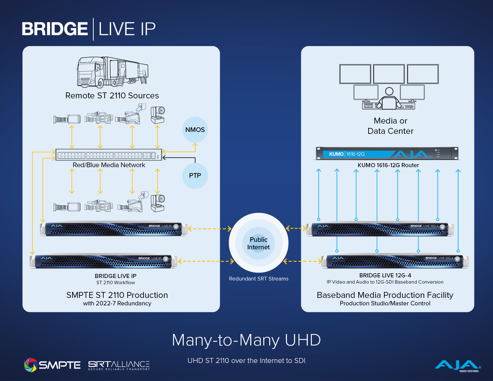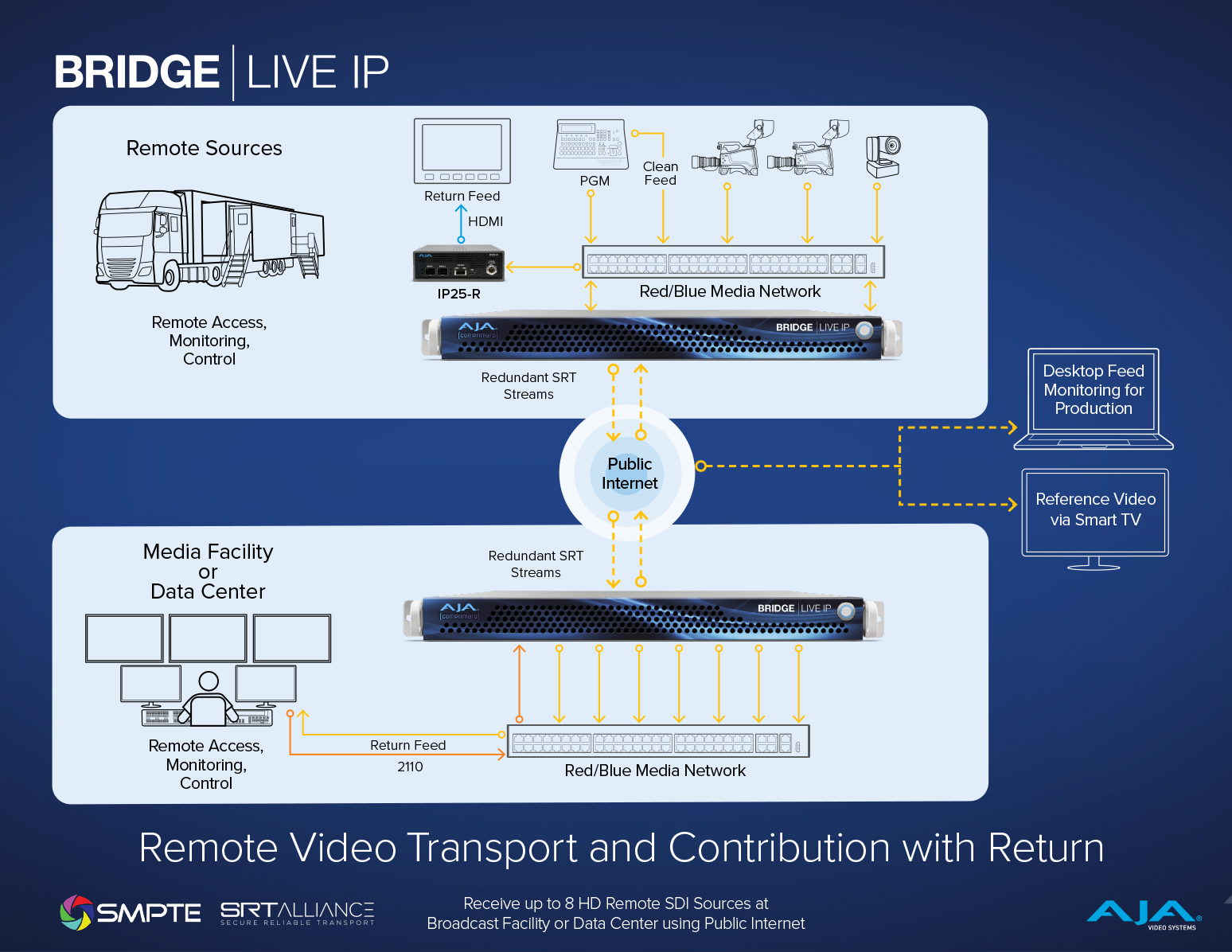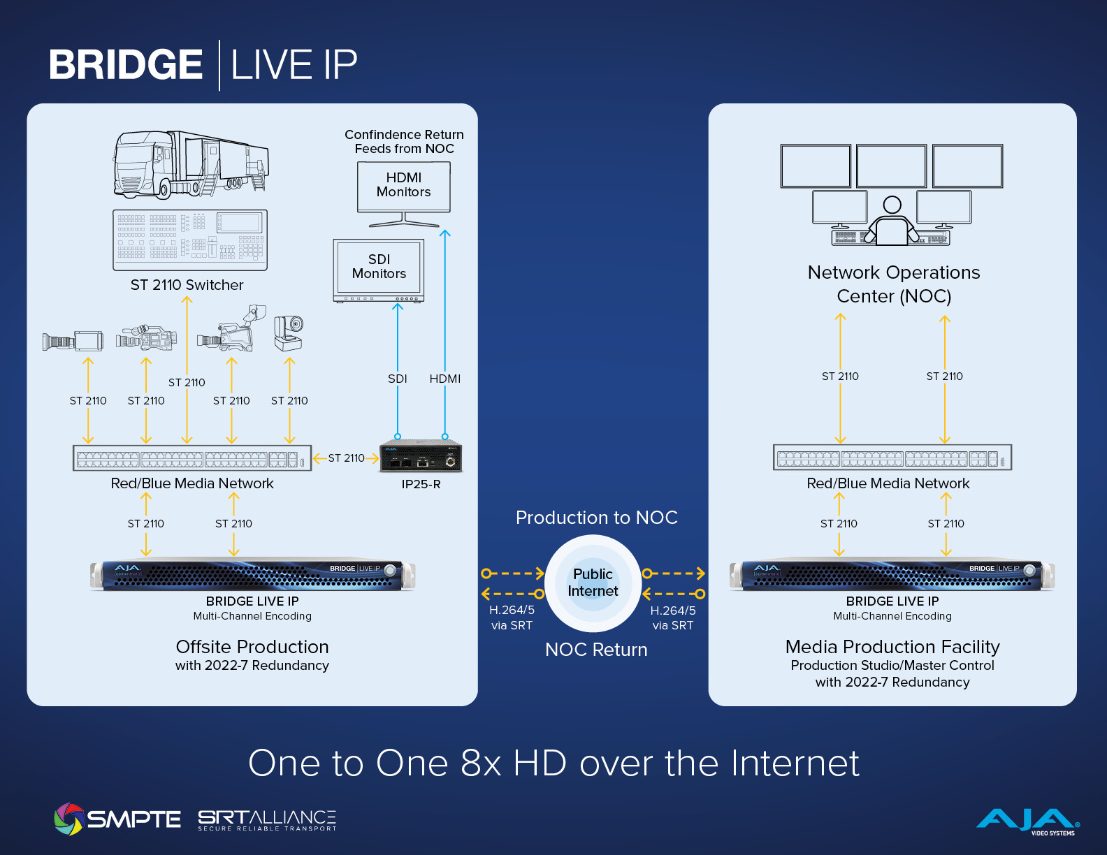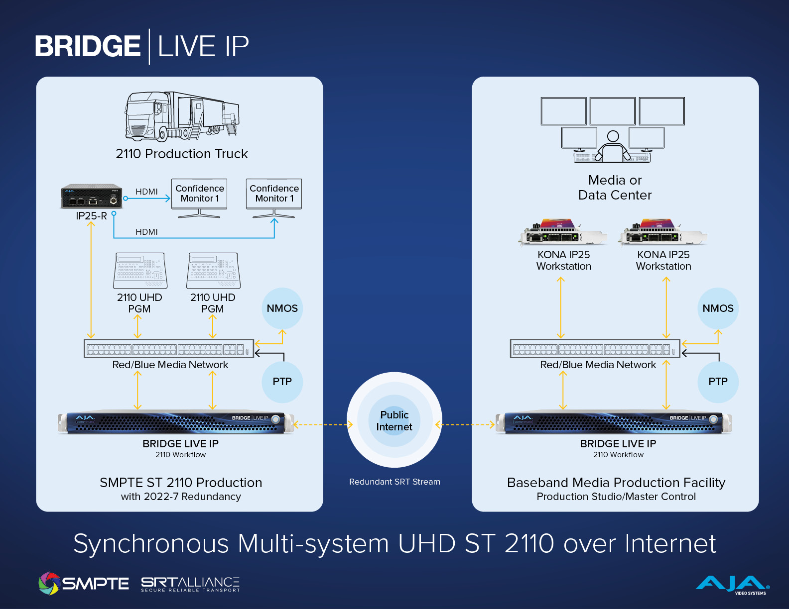 This workflow example demonstrates a BRIDGE LIVE IP converting ST 2110 production feeds to redundant SRT and delivering across the open internet to a receiving BRIDGE LIVE IP which converts SRT back to ST 2110 with ST 2022-7 redundancy. Confidence monitoring of ST 2110 is provided through an AJA IP25-R to HDMI monitors along with additional work in ST 2110 being done via AJA KONA IP25 I/O cards.