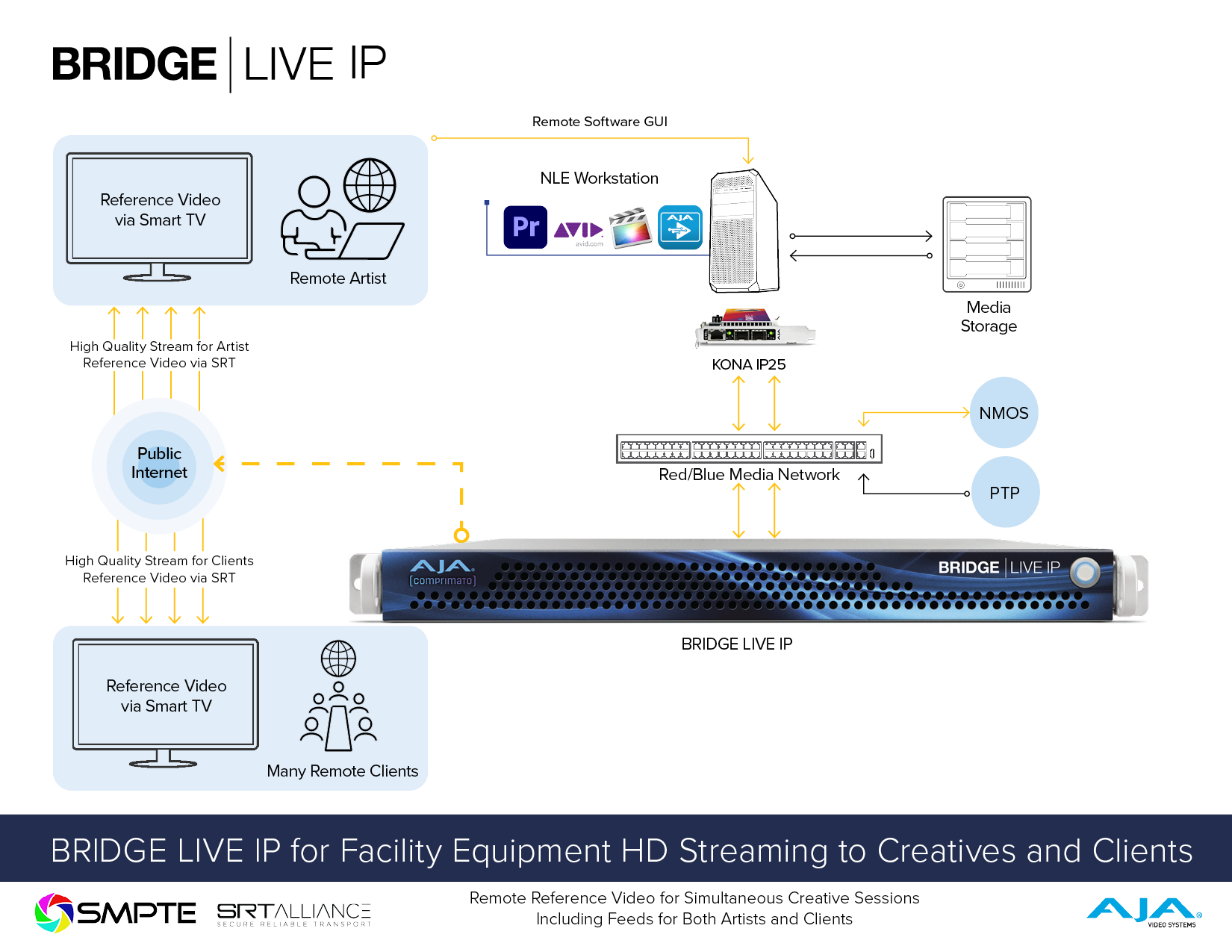 Production and Post: BRIDGE LIVE IP connects remote artists and clients using reference-quality video, providing a high-quality window into production for those who cannot be on-site. This enables creative talent to collaborate remotely with reference-quality video, while ensuring that media and equipment are securely stored and managed at the secure facility.