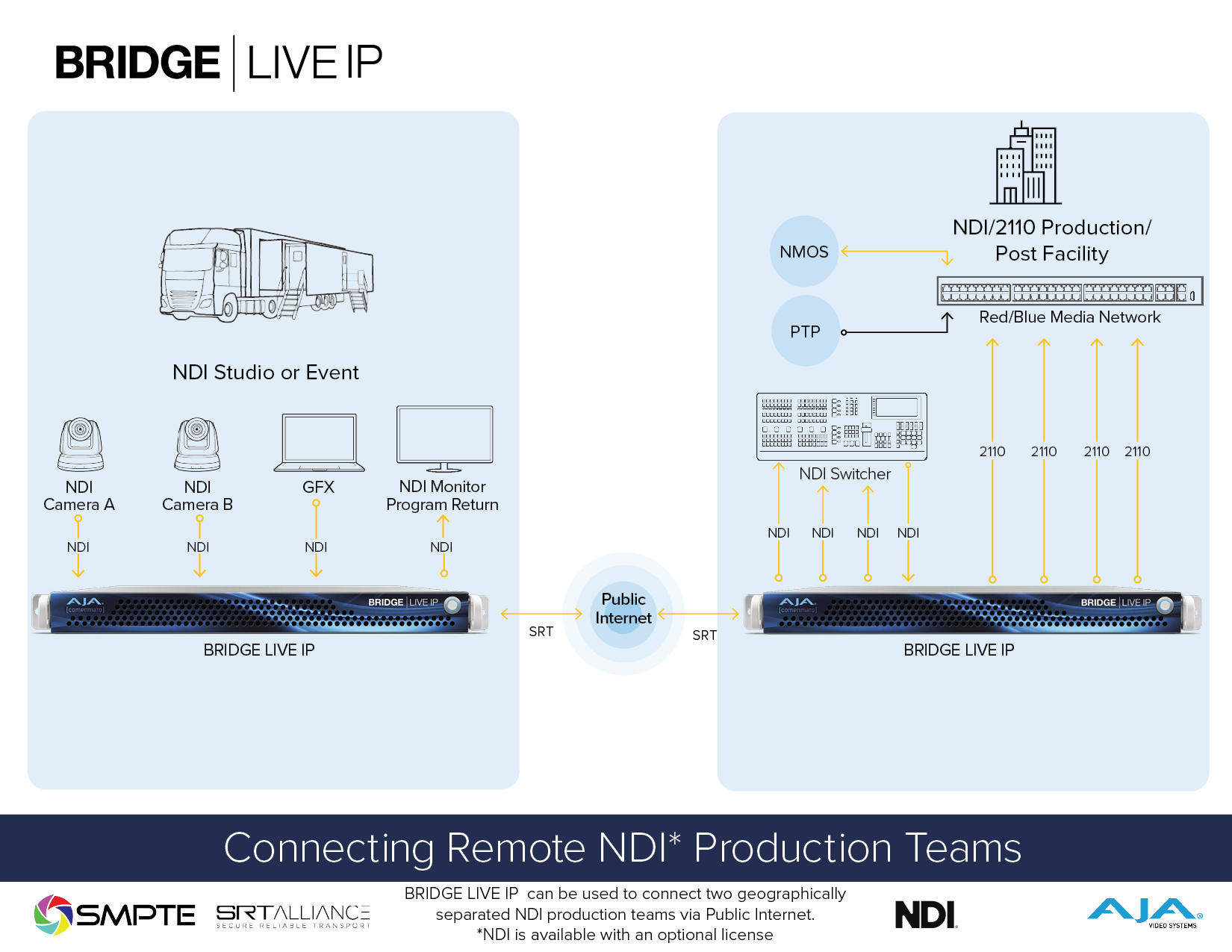 BRIDGE LIVE IP can be used to connect two geographically separated production teams via the public internet. For example, a studio or event location could send feeds from multiple NDI devices, such as cameras and switchers, to a hybrid production or post facility, which can distribute those sources as both NDI and ST 2110 while also returning program feedback to the studio location. SRT provides secure and reliable transport.