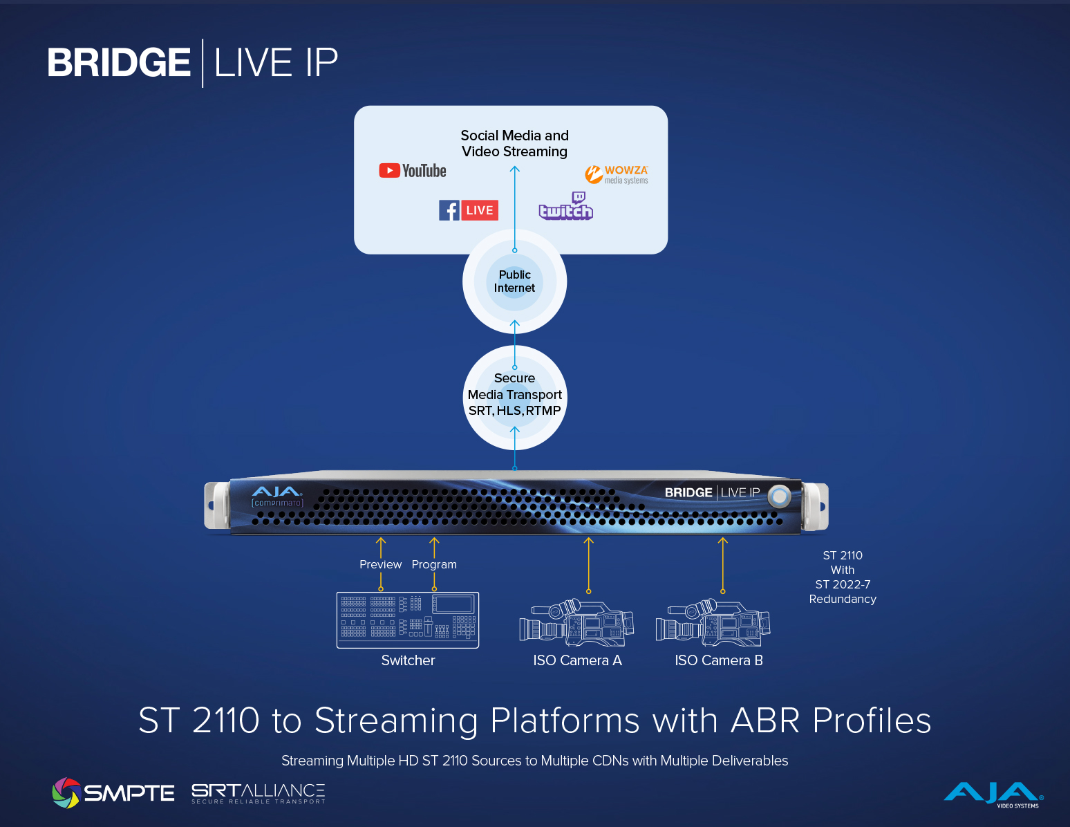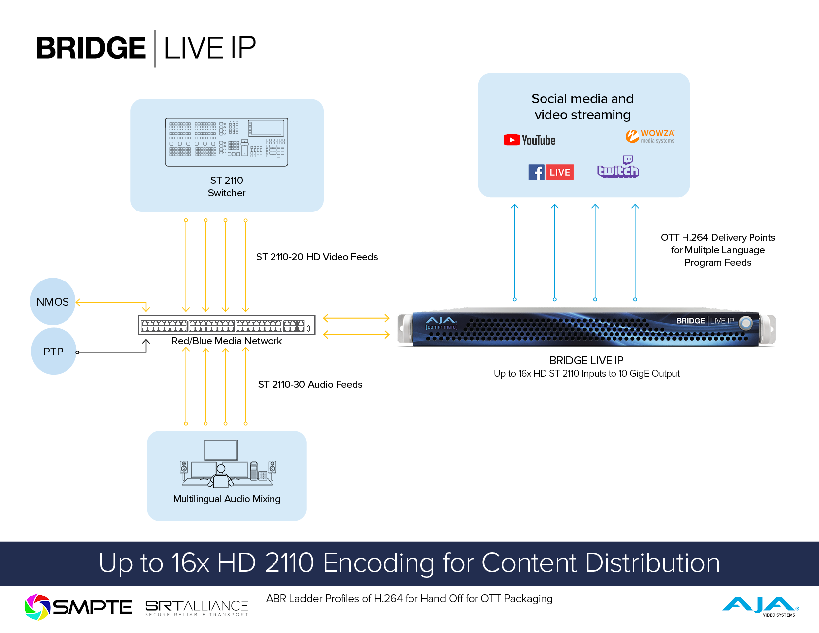 BRIDGE LIVE IP supports workflows where it is necessary to receive contribution streams from various third-party encoders, IP cameras, or AJA HELO Plus for conversion to SMPTE ST 2110 at a production facility.