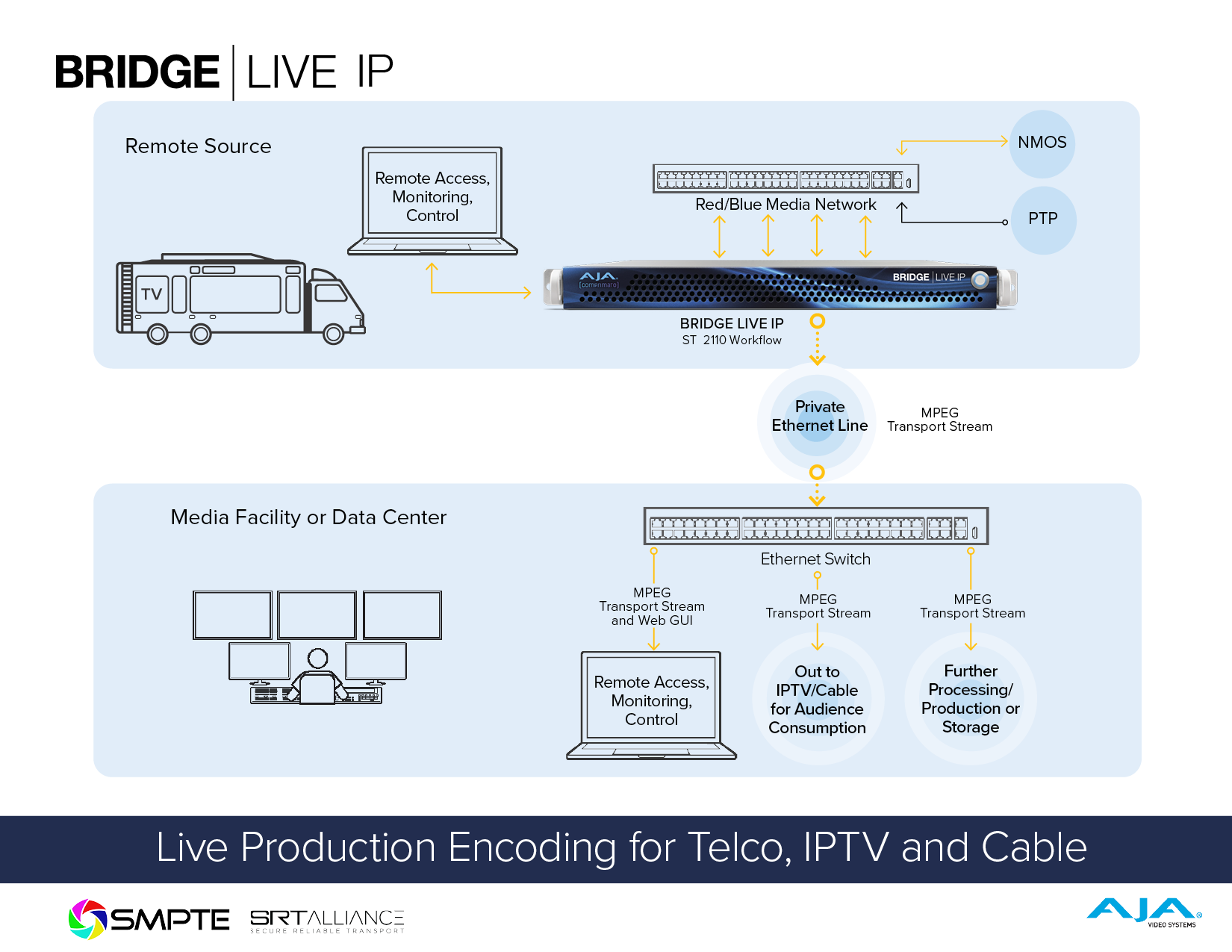 For broadcast, BRIDGE LIVE IP provides an efficient mechanism for backhauling remote live SMPTE ST 2110 video sources to the media production facility, where they are converted back to ST 2110 and made available on the internal facility's ST 2110 router for ongoing production/transmission.