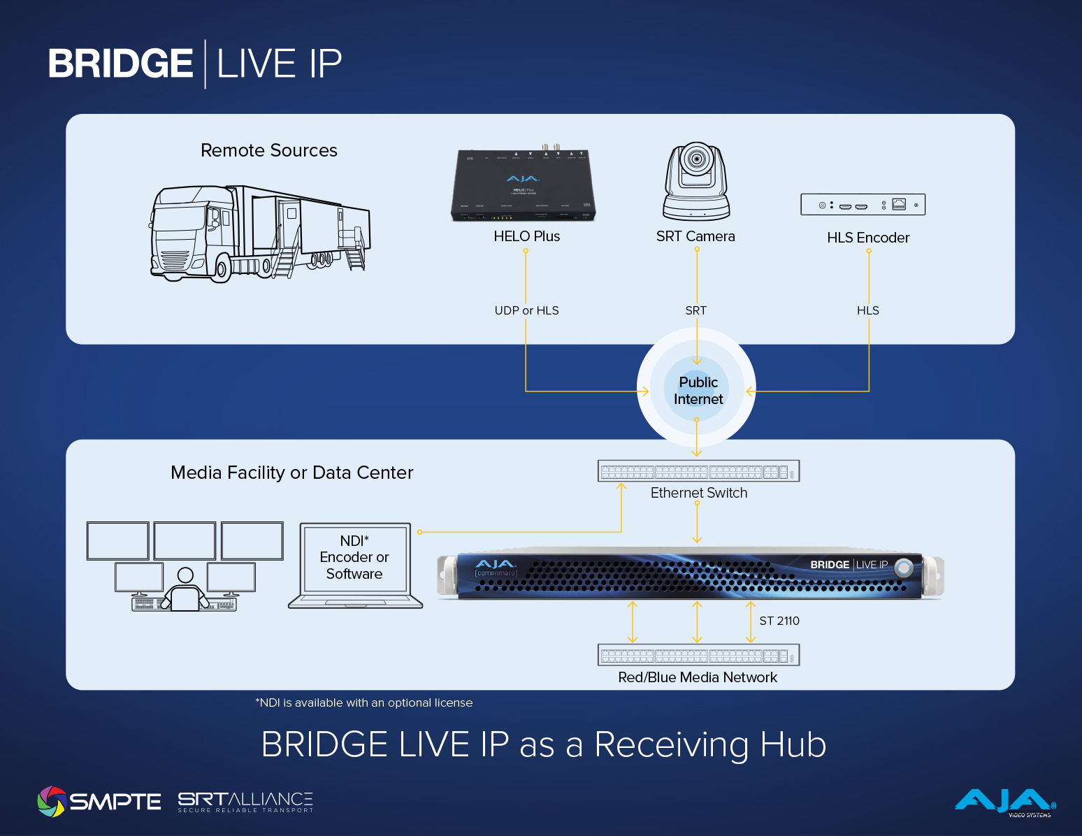 For example, BRIDGE LIVE IP could receive UDP or HLS from AJA HELO Plus, SRT from a camera or encoder, NDI from AJA BRIDGE NDI or from software such as an NLE.