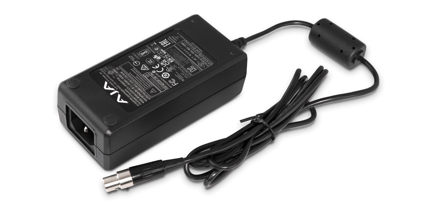 The AJA-PWR-12-60W power supply is included and is also sold separately. The power supply has a latching, 4-pin mini-XLR connector with gold pins. The PSU meets the high reliability requirements of the professional video industry. If you need a spare power supply, it can be ordered from your local AJA reseller.