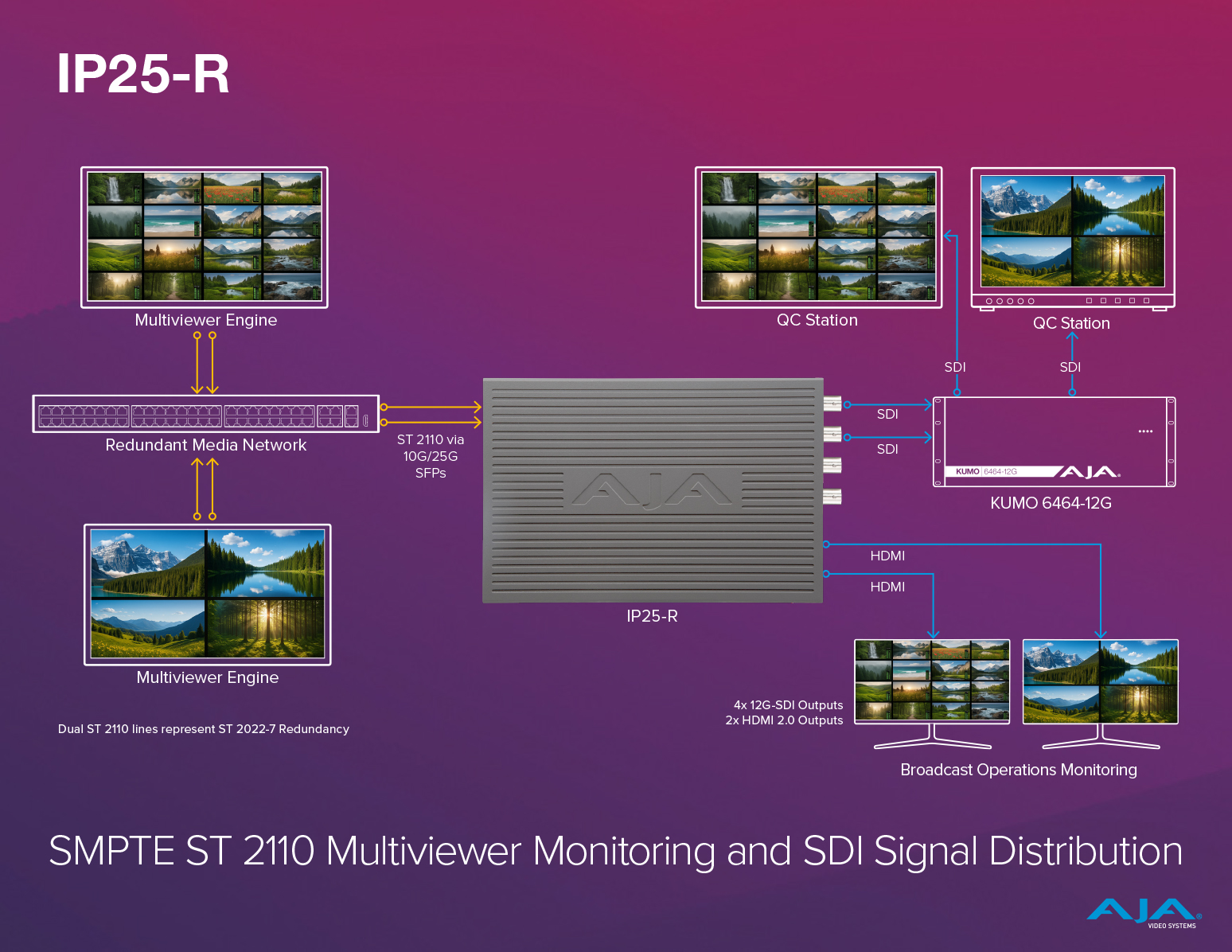 The IP25-R enables seamless conversion of uncompressed SMPTE ST 2110 UHDp60 (3840x2160) video to your existing on-site SDI infrastructure. In this setup, the converted ST 2110 signals are routed through an AJA KUMO router, allowing flexible signal distribution throughout your facility. For added assurance, the IP25-R features dual HDMI outputs, ideal for real time signal confidence monitoring in machine rooms or engineering environments.