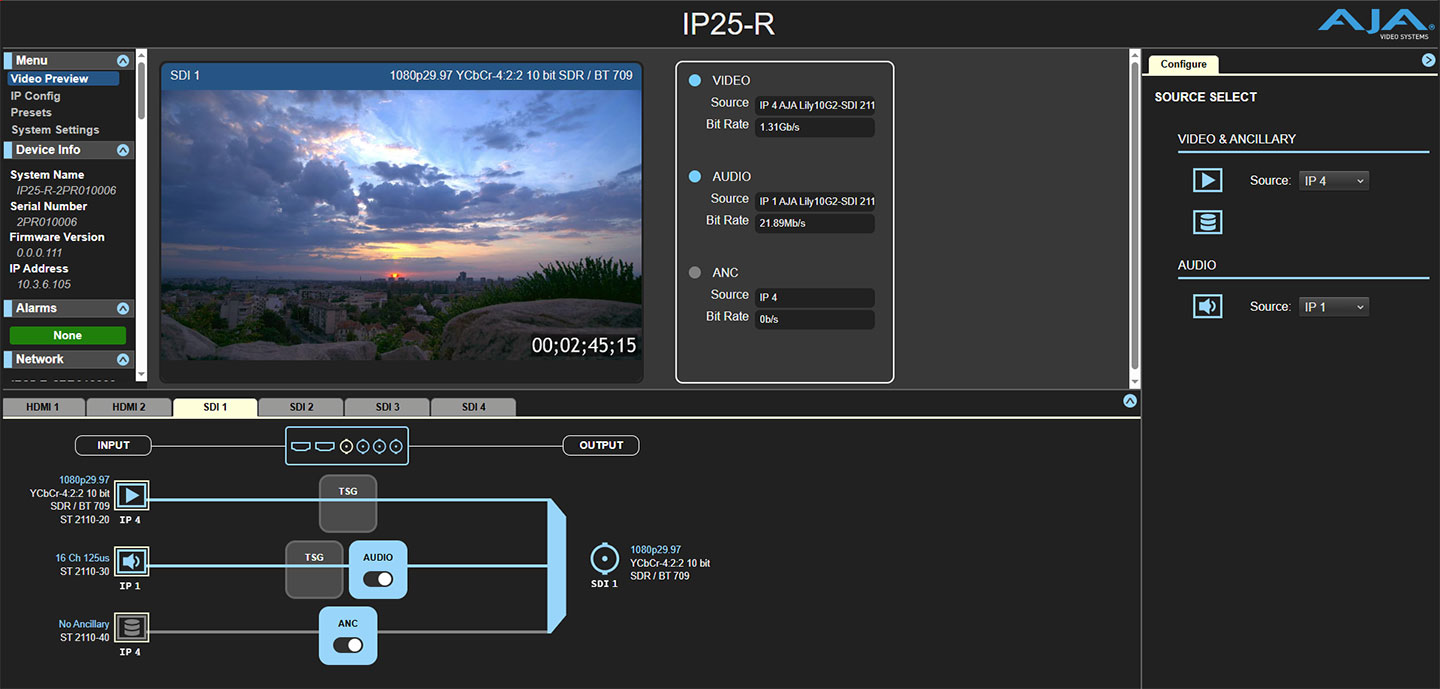 The IP25-R features a built-in web server that hosts a user-friendly, browser-based interface (WebUI) for easy configuration and control. Through the intuitive WebUI, users can quickly set up IP parameters, manage PTP synchronization, configure external control options, and monitor the video being fed to the outputs.