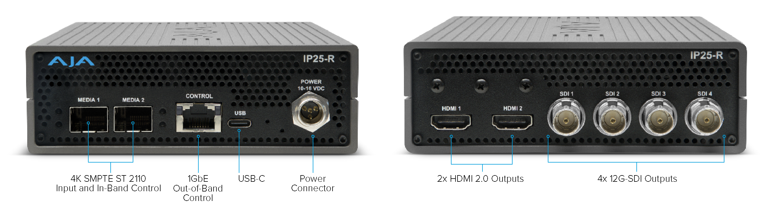 The AJA IP25-R is a next-generation IP Converter that seamlessly bridges SMPTE ST 2110 IP video networks with traditional SDI and HDMI infrastructures. Engineered for professional broadcast, production, and live event workflows, the IP25-R offers dual 10/25 GigE network ports, 4x 12G-SDI BNC outputs, and 2x HDMI 2.0 outputs, delivering pristine video up to 4K DCI (4096x2160p60) with ultra-low latency.