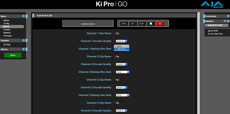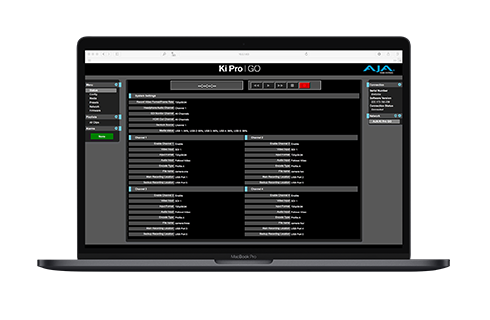 In a truck or a machine room, Ki Pro GO is equipped for advanced remote control and configuration. With a standard Ethernet LAN connection to a host computer and any web browser on any OS, all Ki Pro GO parameter settings, clip selection, and transport controls can be controlled; no additional or special software installation is required on the host computer.