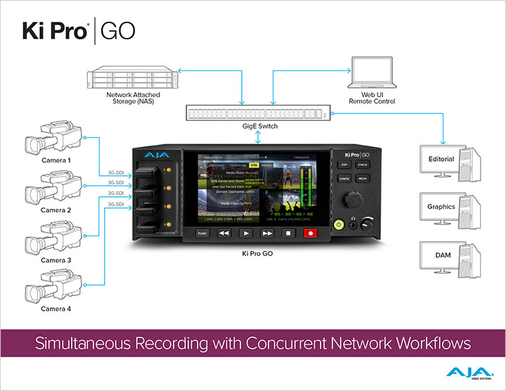 In this workflow we can see the Ki Pro GO is receiving video from camera sources 1 through 4. The Ki Pro GO is recording locally to USB drives connected to the front USB3 inputs. The Ki Pro GO is also connected via Gigabit ethernet to a Gigabit ethernet switch and a NAS for simultaneous recording. Editorial, Graphics and Digital Asset Management (DAM) workstations are also connected to the same network as the Ki Pro GO, with both having access to the NAS.