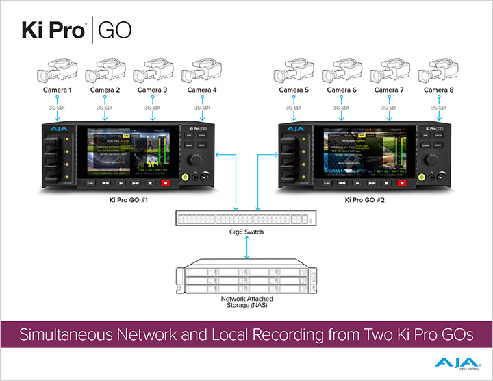 Many workflows, as in some of the workflows shown above, require simultaneous recording across a range of Ki Pro products or multiple Ki Pro GOs.