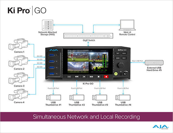 This workflow shows the Ki Pro GO receiving video from camera sources 1 though 4. The Ki Pro GO is connected to multiple USB drives as well as a NAS via Gigabit ethernet allowing immense flexibility.