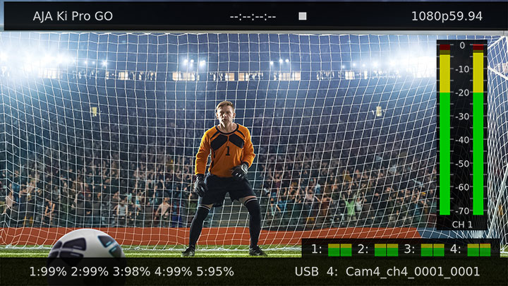 4x 3G-SDI and 4x HDMI digital video inputs with flexible channel assignments provides connections to the latest video sources, including cameras and DSLRs. Incoming video sources do not have to be genlocked due to Ki Pro GO's input frame syncs. Ki Pro GO also features AJA's high quality de-interlacers on each input so progressive recordings can be made from interlaced inputs. High quality 2-channel embedded audio or balanced XLR analog audio can be assigned to any recording channel. Multi-Channel Matrix Monitoring enables multiple video channels to be viewed on any single HDMI or SDI display, and Enhanced Super Out offers timecode, media status and audio meter overlays over the SDI and HDMI monitor outputs.