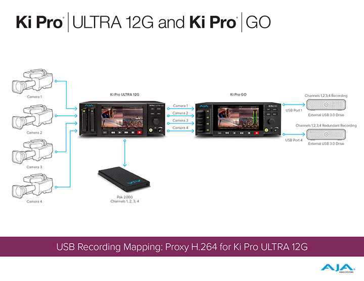 When used with a Ki Pro Ultra 12G, this provides you with an ideal workflow for Proxy workflows, the ability to walk away simultaneously from a recording session with ProRes files captured from Ki Pro Ultra 12G for a high resolution edit and H.264 files from a Ki Pro GO for client handoff, streaming and more.