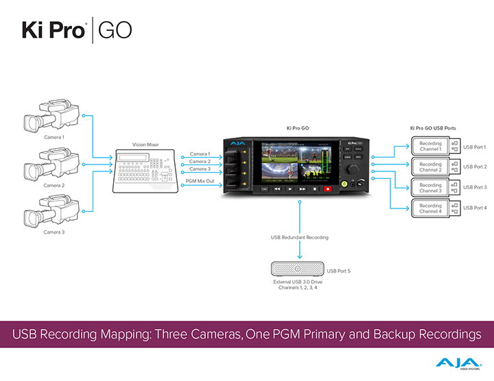 Connect three cameras directly to a vision mixer and then run the camera ISO feeds as well as the Line Cut/Program Feed from the vision mixer to Ki Pro GO. Capture all four of the recording channels directly to USB sticks in each of the four front of unit USB slots, as well as a combination of all four recording channels to a single USB drive connected to the fifth USB port on the rear of the unit.