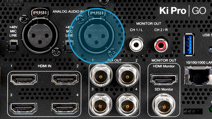 Each Ki Pro GO recording channel can capture 2-channels of embedded audio from 3G-SDI or HDMI inputs, or 2-channel Analog Audio from the XLR ports on the rear of the unit.