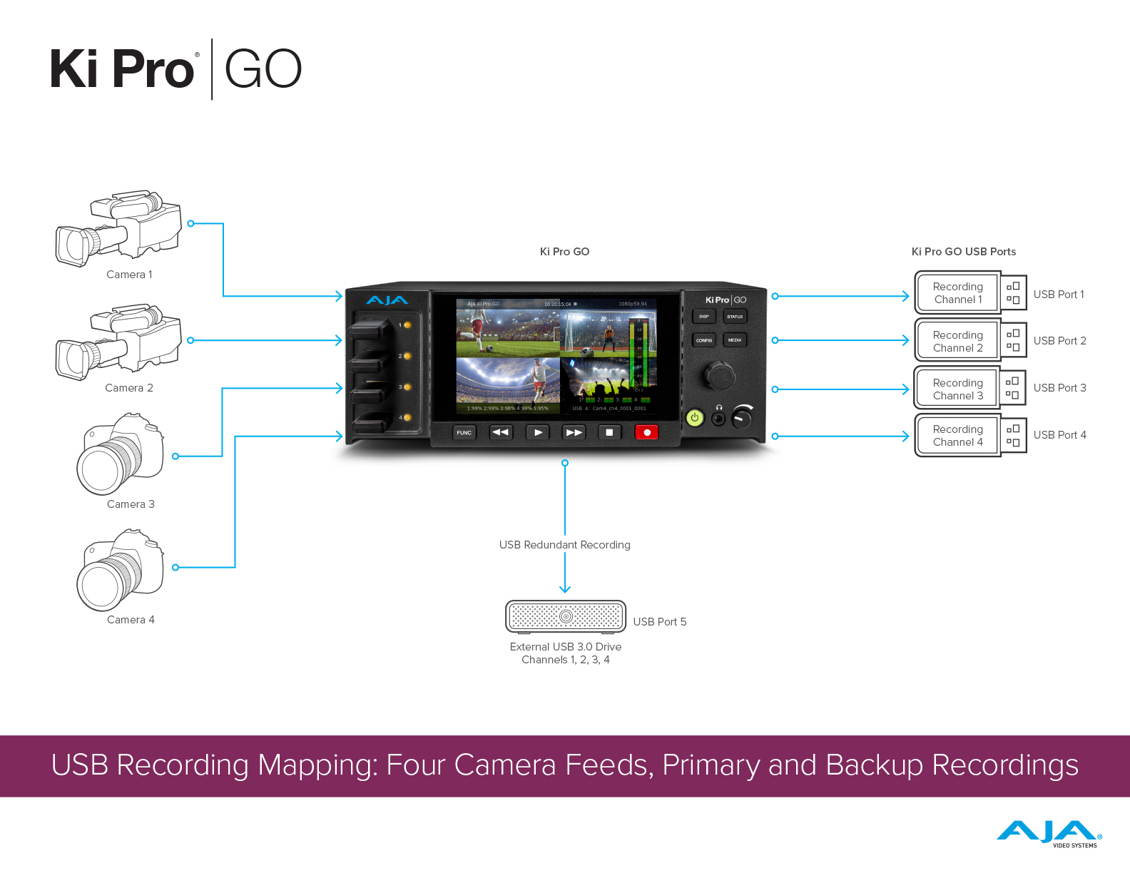 Connect four cameras directly to Ki Pro GO and capture the recording channels discretely to USB sticks in each of the four front of unit USB slots as well as a combination of all four recording channels to a single USB drive connected to the fifth USB port on the rear of the unit.