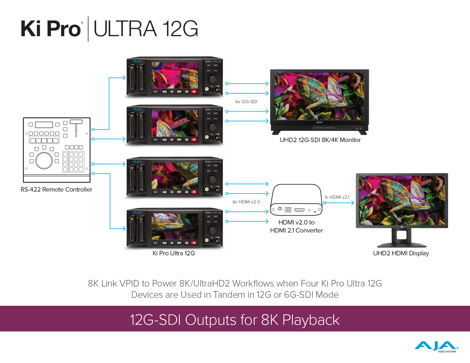 Ki Pro Ultra 12G has been updated to offer a powerful 8K playback functionality. By utilizing 4x Ki Pro Ultra 12G units as well as RS-422 control to all four units, playback of 8K video is achieved as individual 4K quadrants. The correct 8K SDI VPID is implemented to ensure compatibility with downstream devices. For 4x HDMI playback is also an option for this workflow with the addition of a suitable HDMI v2.0 to HDMI v2.1 converter.