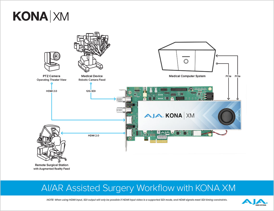 AJA KONA XM is the recommended video I/O solution for NVIDIA’s IGX edge computing AI hardware platform. KONA XM integrates seamlessly with NVIDIA Holoscan, a deployable software solution targeting IGX and other NVIDIA platforms. The combination of NVIDIA IGX and Holoscan makes it easy for medical device manufacturers to apply real time, low latency, high performance AI-driven overlays to live video in a variety of medical devices and create innovative medical video solutions.