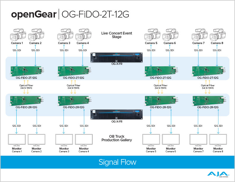 This diagram shows four OG-FiDO-2T-12G openGear cards being used in an OG-X-FR rack frame, which highlights the high density capability of the openGear platform. The rack is installed at a live concert event stage. There are eight 12G-SDI cameras being used at the live event. In pairs, these cameras are connected to the OG-FiDO-2T-12G converters, providing a 12G-SDI to fiber conversion. The OB truck has another OG-X-FR rack frame with four OG-FiDO-2R-12G openGear cards providing the fiber to 12G-SDI conversion from the fiber pairs received from the stage. These eight 12G-SDI feeds are driving the OB truck production gallery monitors with ultra low latency.