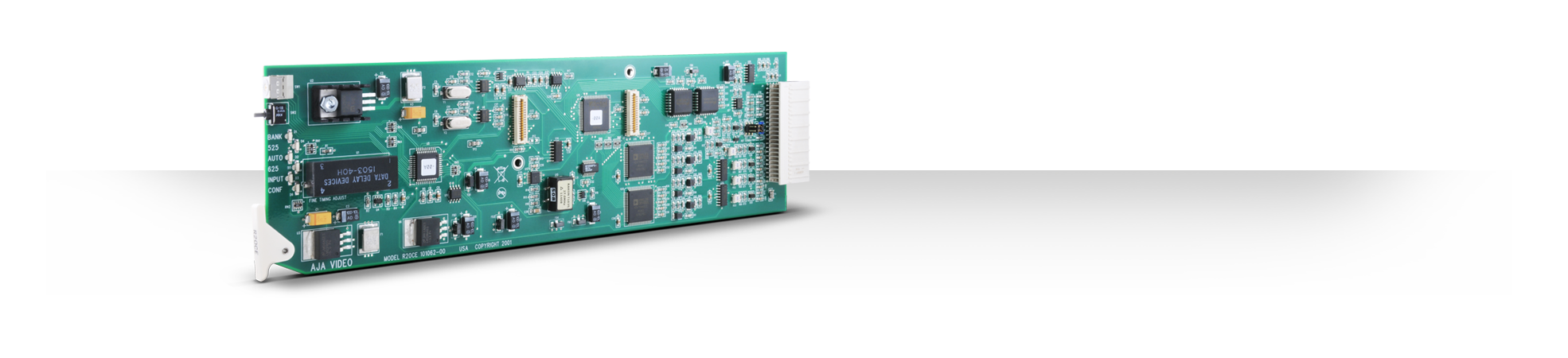 The R20CE SDI to Analog Video Converter provides excellent quality 10-bit conversion of SDI to component and composite video formats simultaneously. The 4 analog outputs are user configurable to NTSC/PAL, YC (S-Video), YPbPr (SMPTE, EBU-N10), Betacam, or RGB. The component and composite outputs are completely independent including optimum chroma filtering for each and independent pedestal configuration. The R20CE also features an exclusive PLL jitter filter/memory to reduce the effects of SDI jitter on the output analog video. This feature, along with the precision 4x oversampled D/A filter, provides the highest quality analog outputs - including very low phase noise in composite outputs. The optional FSG (Frame Sync/Genlock) Module allows genlock to an external reference with full timing adjustment. Without the FSG Module, the reference input provides color frame timing. The R20CE fits the AJA R-Series Rack Mount Frames, as well as other common industry frames.